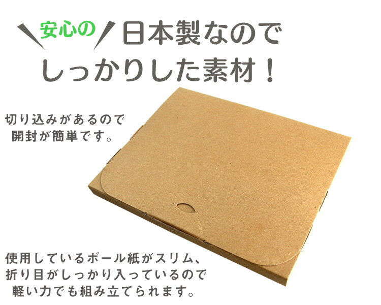 組立は簡単です! 商品仕様 宅配サイズ:B5サイズ サイズ(約): ・外寸:幅265×奥行210×高さ20mm ・内寸:幅264×奥行209×高さ19mm 厚さ(約):1mm 重量(約):71g カラー:両面 クラフト色 商品内容 ダンボール箱 ×50 注意事項 ・簡易梱包となります。