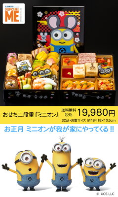 おせち おせち料理 2020全32品(約3人前)・お重サイズ 約18.0×18.0×高さ10.5cm おせち予約2020・ミニオン ・ユニバーサルスタジオジャパンにもパークがある大人気キャラクター「ミニオン」の和洋おせち料理二段重! ・2020年の干支「子」のミニオンオリジナルデザインの重箱! ・本格和のおせちと洋風おせち、お子様向けと3世帯でお召上がり頂けるお料理に、ミニオンのおせちでしか味わえない限定のお料理も入れました。